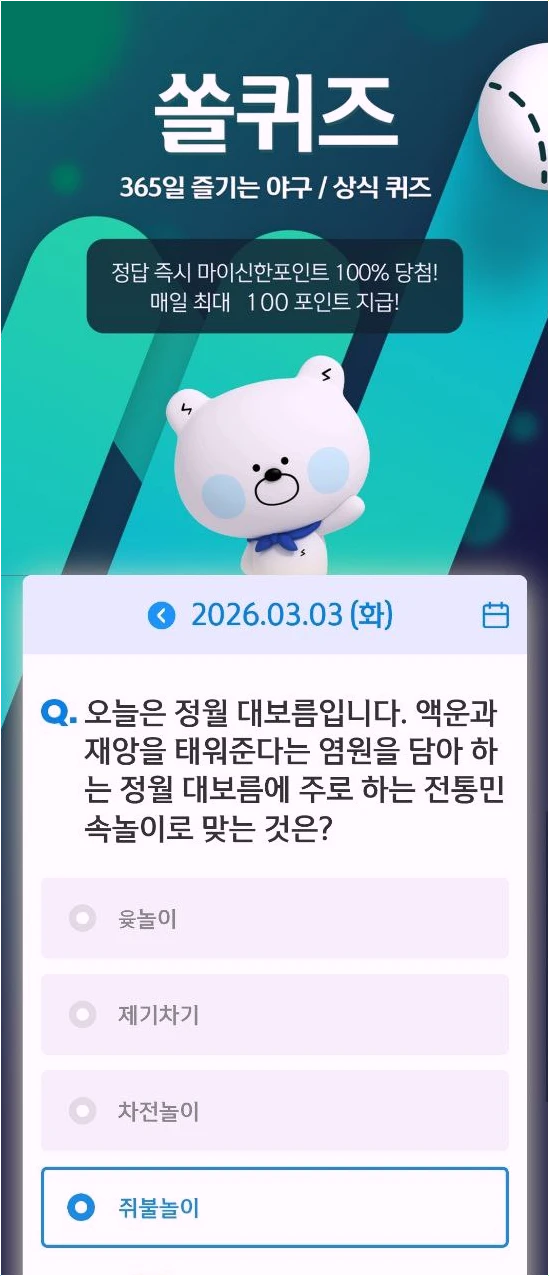 2026년에도 여전히 뜨거운 인기를 자랑하는 신한 슈퍼SOL 야구상식퀴즈는 매일 오전 0시에 업데이트됩니다. 야구 팬뿐만 아니라 앱테크를 즐기는 분들에게도 필수 코스로 자리 잡았죠. 퀴즈를 맞히면 즉시 마이신한포인트를 랜덤으로 지급받으며, 가끔 진행되는 메가 이벤트 기간에는 최대 1,000포인트까지 당첨될 수 있는 기회가 주어집니다.