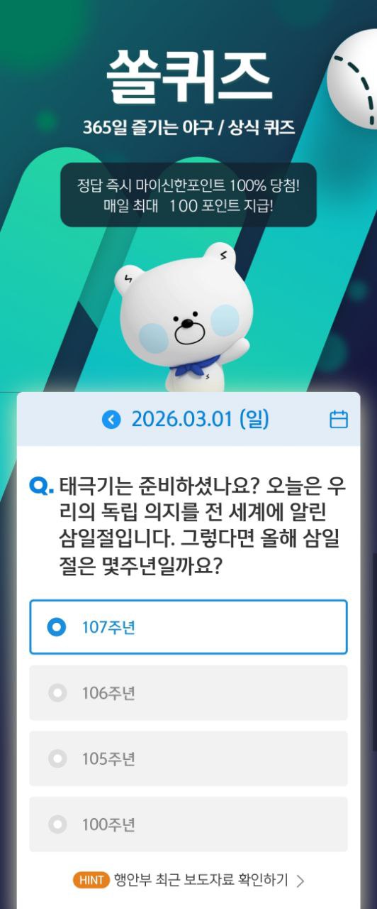 신한금융그룹의 통합 앱인 '신한 슈퍼쏠(Super SOL)'에서 제공하는 야구상식 쏠퀴즈는 KBO 리그 팬들에게는 놓칠 수 없는 일상 루틴이자, 소소한 재테크 수단으로 자리 잡았습니다. 2026년 현재, 더욱 직관적으로 개편된 UI와 함께 야구 비시즌에도 다양한 상식 문제를 제공하며 유저들의 참여를 유도하고 있습니다. 매일 자정(00:00)에 새로운 문제가 출제되며, 정답을 맞힐 경우 마이신한포인트를 즉시 적립 받을 수 있어 '앱테크'족 사이에서도 필수 코스로 통합니다.