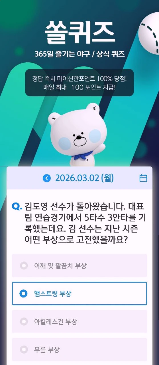 2026년 KBO 리그의 열기가 그 어느 때보다 뜨거운 가운데, 야구 팬들의 아침 루틴으로 자리 잡은 것이 바로 '신한쏠퀴즈'입니다. 신한 슈퍼 SOL 앱에서 매일 자정(00:00)에 새롭게 출제되는 이 퀴즈는 야구 규칙, 선수 기록, 구단 역사 등 다양한 주제를 다루며 팬들의 지식을 테스트합니다. 단순히 퀴즈를 푸는 재미를 넘어, 정답을 맞힐 경우 즉시 지급되는 '마이신한포인트' 덕분에 실속 있는 앱테크 수단으로도 큰 인기를 끌고 있습니다.