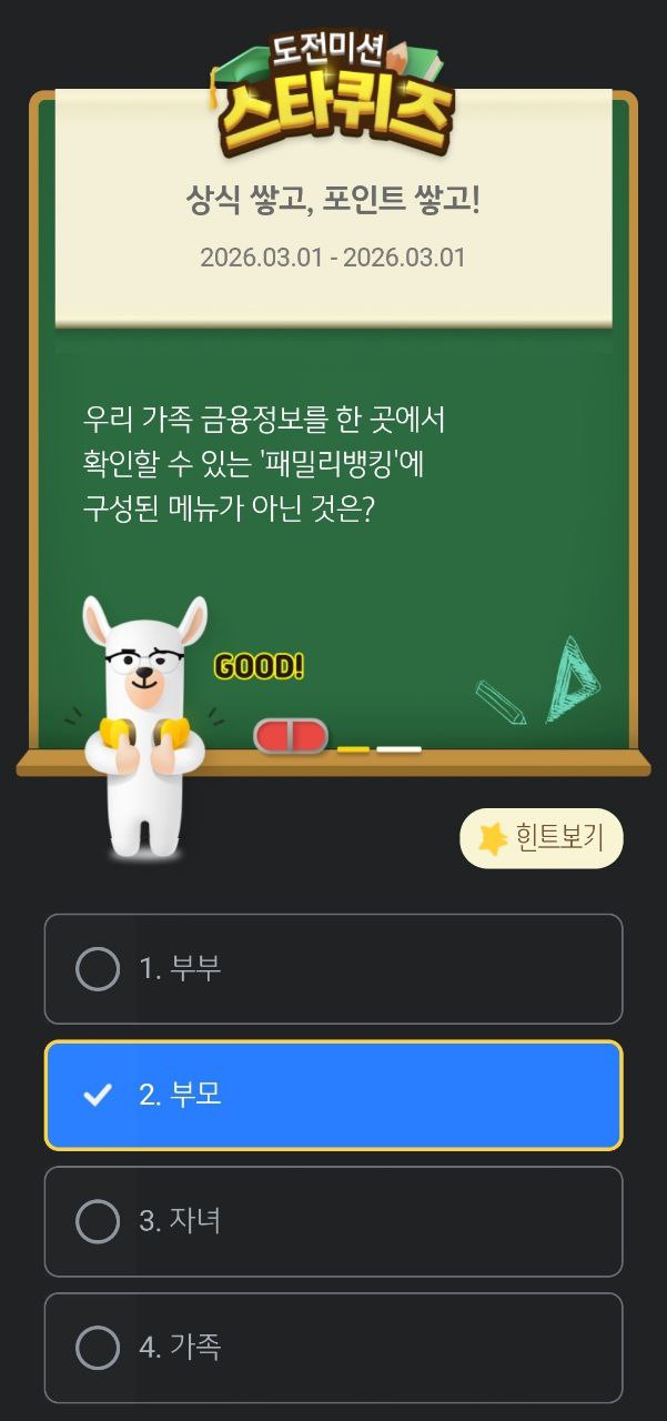| H.Point 퀴즈 3월1일 정답 및 포인트 적립 최적화 가이드 (0) | 2026.03.01 |